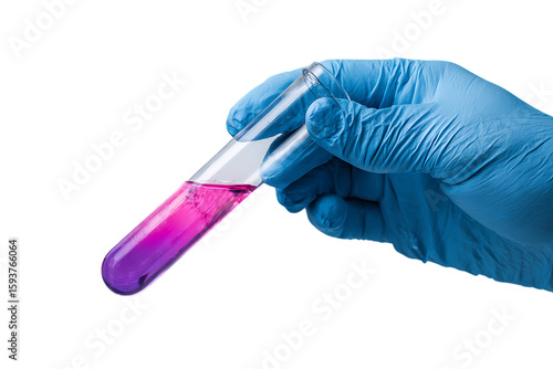 Close up of gloved hand holding a test tube with vibrant pink liquid.
