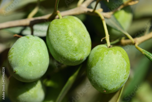 Close up of green, ripe Nocellara olives growing on the tree just before harvest