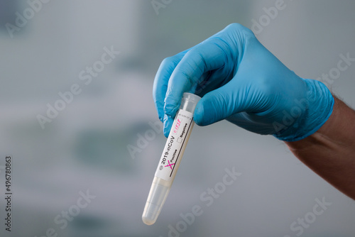 Close up of hands in medical gloves holding a test tube after virus analysis with coronavirus result markers
