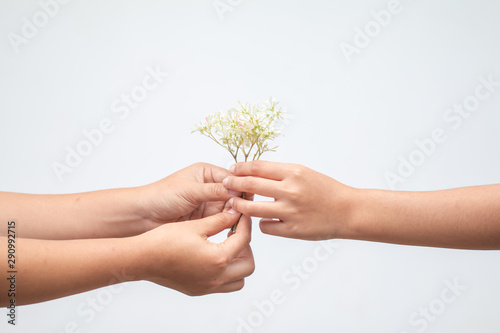 Close up of happy friend couple hands with bunch of flowers for congratulations time about end of study