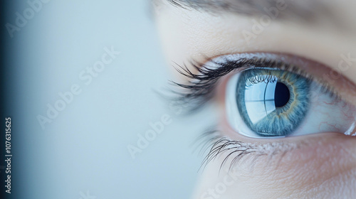 close up of human eye, showcasing vibrant blue iris and long eyelashes, reflecting light and depth. image conveys sense of curiosity and focus
