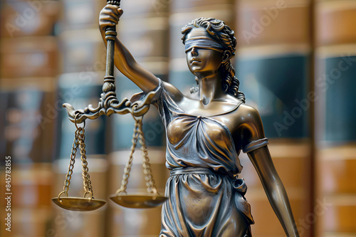 close up of Legal and law concept statue of Lady Justice with scales with books in background