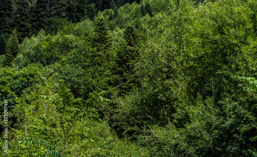 Close up of mountain forest in summertime. Texture of green trees on high ground.