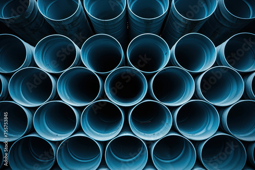 Close up of multiple blue pipes arranged in a row against a black background