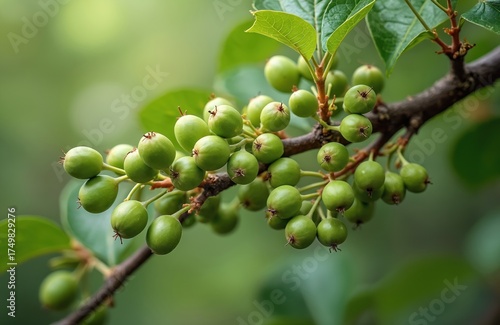 Close up of Phellodendron amurense berries on a tree branch with green leaves. Amur cork tree fruits. Used in traditional Chinese medicine as treatment for disease or illness. Botany concept.