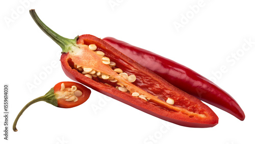 Close up of sliced red chili peppers with seeds and green stem on transparent background