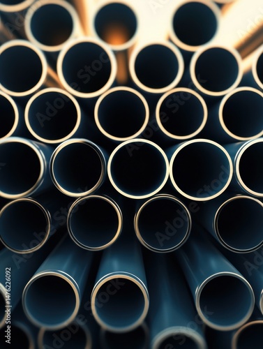 Close up of stacked blue metal pipes creating a pattern industrial abstract background material supply steel construction