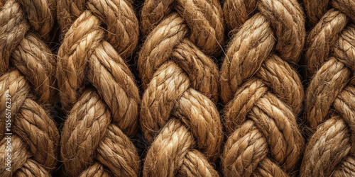 Close up of thick, twisted natural fiber ropes with rough texture and warm brown color, arranged in parallel lines conveying strength and durability