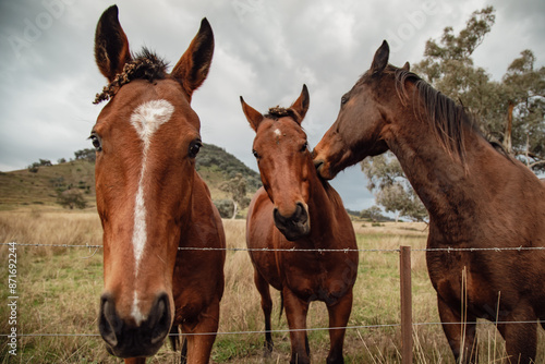 Close up of three horses standing at farm fence looking for attention