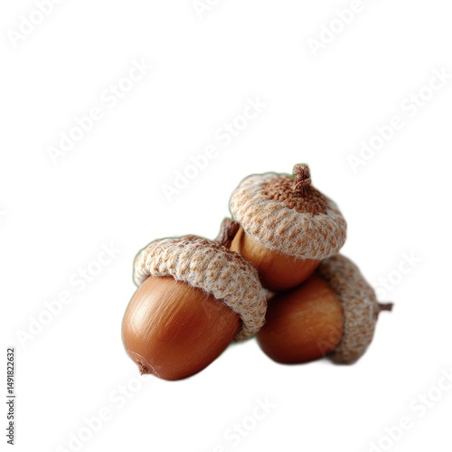 Close up of Three Ripe Brown Acorns with Fuzzy Caps Autumnal Nature