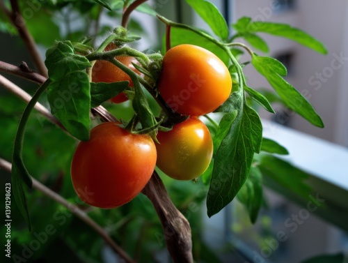 Close up of vibrant cherry tomatoes growing on a vine indoors showcasing freshness and natural beauty in a window setting