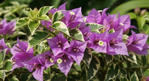 Close up of vibrant purple bougainvillea flowers with variegated leaves