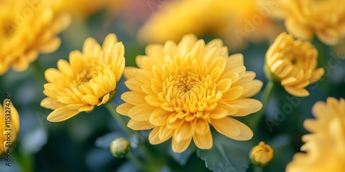 Close up of vibrant yellow chrysanthemum flowers blooming beautifully in a flowerbed, showcasing the intricate details of the yellow chrysanthemum petals in a stunning natural setting.