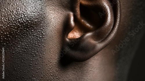 Close up of wet skin with tiny water droplets glistening on the surface, next to a detailed view of an ear, showcasing the intricate textures and delicate folds of the human body