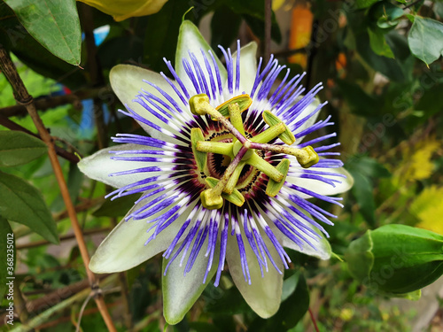 Close up of white, blue flower Passiflora caerulea or Passiflora edulis.