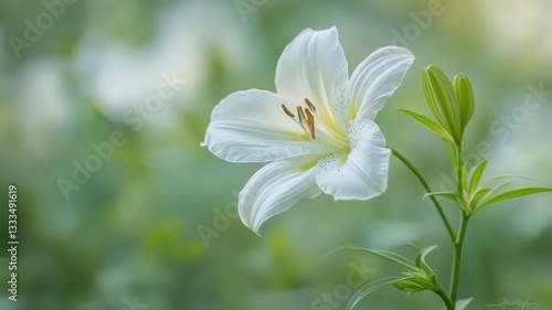Close Up of White Lily with Water Droplets Soft Green Bokeh Background