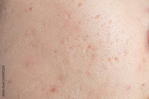 Close up of woman face has problems with skin on her face. Problems with acne and scar on the female skin.