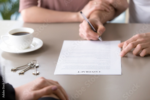 Close up of young couple signing contract, agreed terms and approved application for mortgage with low interest rates, taking home loan, meeting with bank worker or real estate agent