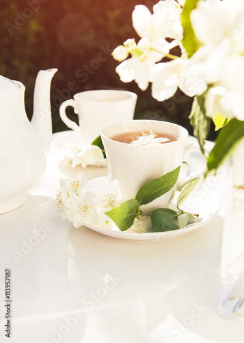 Close up on jasmine tea with jasmine flower in a glass cup. Tea