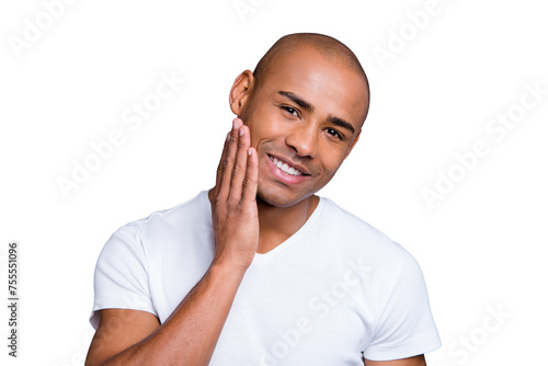 Close up photo glad dark skin he him his macho expertising checking skin after shaving hand arm cheek excited amazed with results wearing white t-shirt outfit clothes isolated on grey background
