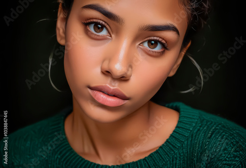 Close up portrait of a beautiful dark-skinned model with sensual lips in an elegant green dress