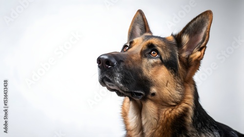 Close up portrait of a german shepherd dog looking up against a plain white studio background