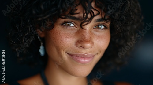 Close up portrait of a young woman with curly hair and freckles smiling gently