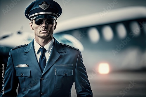 Close up portrait of an airliner pilot male wearing blue flight uniform and captain's cap on the blurred airport background. Generative AI