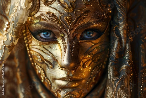 Close up portrait of woman with blue eyes wearing an elegant golden venetian mask and veil