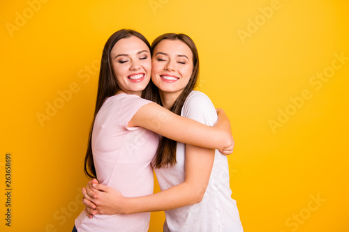 Close up side profile photo two people beautiful she her ladies models full emotions feelings fellowship buddies hugging eyes closed wear white pink casual t-shirts isolated yellow background