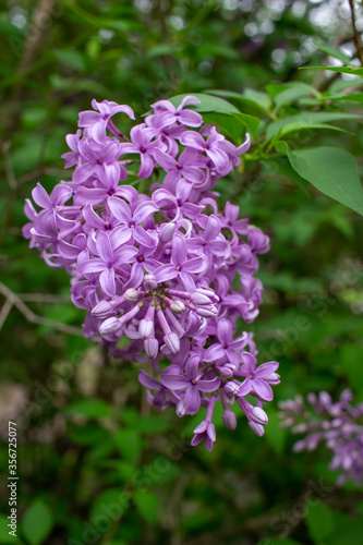 Close up view of a beautiful purple Chinese lilac cluster with dark green leaf background and copy space