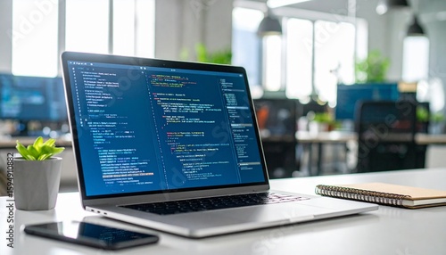 Close up view of coding on laptop in a modern office setting