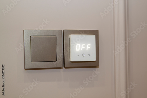 Close up view of electric light switch and sensor for floor heating on an empty wall