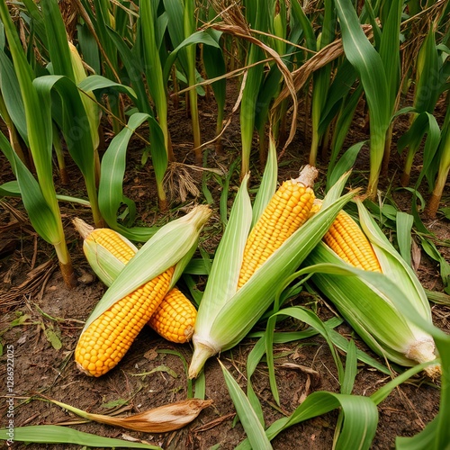 Close up view of fresh corn cobs lying on the ground.