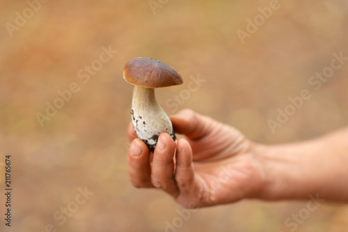 Close up view of hand holding freshly picked mushroom