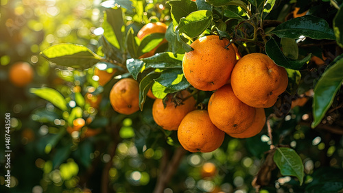 Close up view of ripe oranges growing on a tree branch with green leaves and sunlight