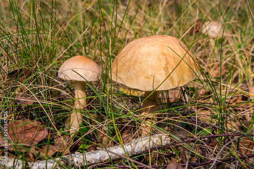 Close up view of two brown cap boletus growing in forest.