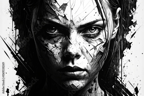 Close-up black and white portrait of a woman. Her face is detailed with harsh lines and shadows.