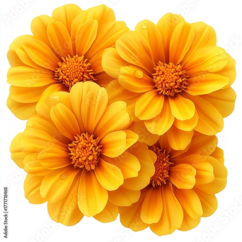 Close-up Captivating View of Four Bright Yellow Dahlia Flowers Blossoming with Delicate Water Droplets on Petals, Isolated on White.