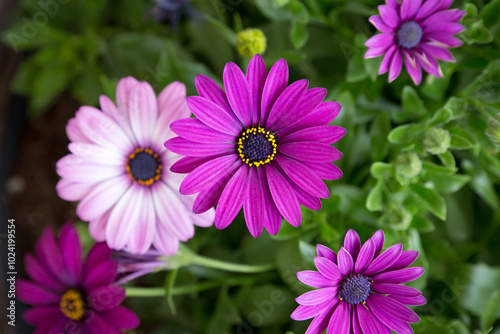Close-up color photo of beautiful light and dark purple daisies against a soft blurred de-focused green foliage background.