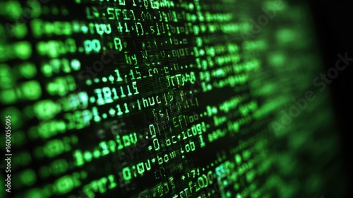 Close-up computer screen, green code