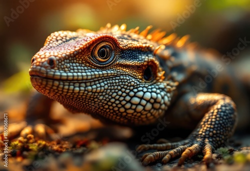 Close-up detailed lizard, textured skin, blurred background