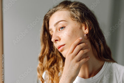 Close-up face of a young woman with rashes looking at the mirror in a cozy room. Beautiful woman with problem skin enjoying her natural beauty. Dermatology concept, beauty and naturalness.