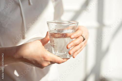 Close-up girl hands in the office stands in the sunlight holding a glass of clean water in between work