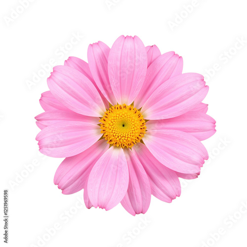 Close-up image of a single, pink cosmos flower with a yellow center, isolated on a cut out background.