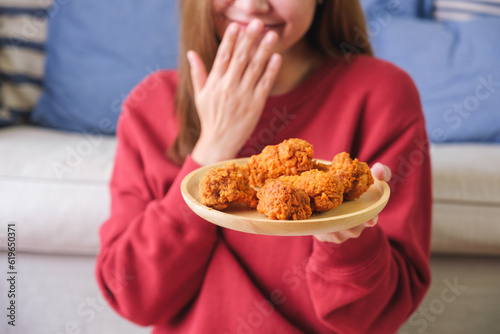 Closeup image of a woman covering mouth with hand, holding and looking at a plate of fried chicken