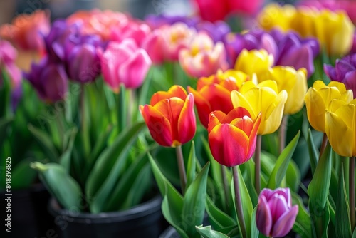 Close-up image of colorful tulips in pots, arranged for sale at a spring flower market. The vibrant colors of the tulips stand out against the softly blurred background