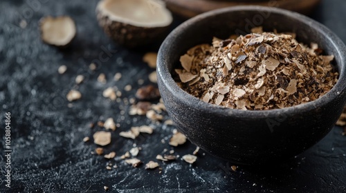 Close-up image of finely chopped truffles, complemented by truffle-based products, inviting you to experience the luxury of truffles in every delectable dish. Photo style with ample copy space.