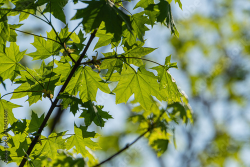 Close-up image of healthy green maple leaves, partially overlapping in patterns, against a bright sky backdrop Shot with natural light during daytime