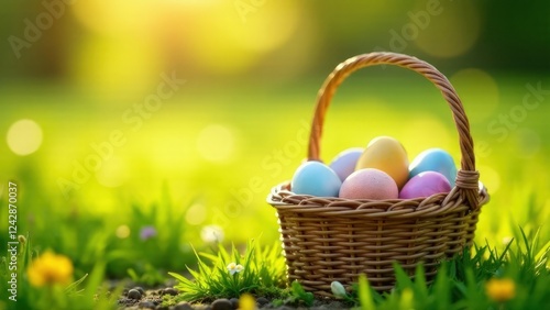 Close-up of a basket full of Easter decorated pink, yellow and blue eggs standing on the green grass to the right, with space for text, Easter concept